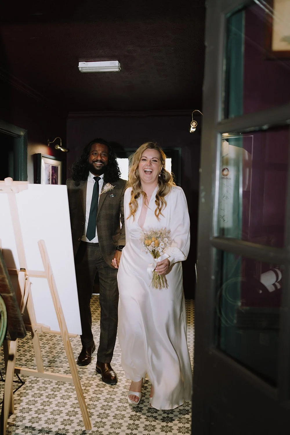 After the ceremony, Nikhil and Kathryn boarded a train from Sale to Brooklands in south Manchester, embracing a casual yet meaningful transition to their reception venue. The Brooklands Tap, a cozy and welcoming pub, set the stage for a night of celebration.
